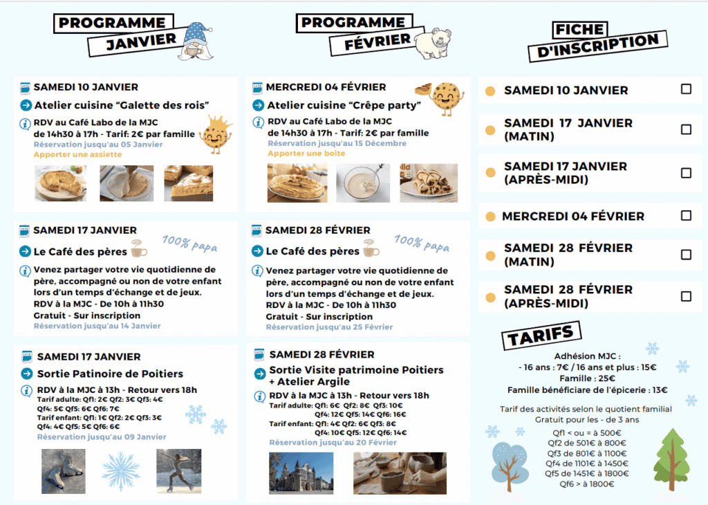 Découvrez le programme Famille de la MJC pour janvier et février : sorties, ateliers et moments conviviaux à partager en famille. Inscrivez-vous dès maintenant !